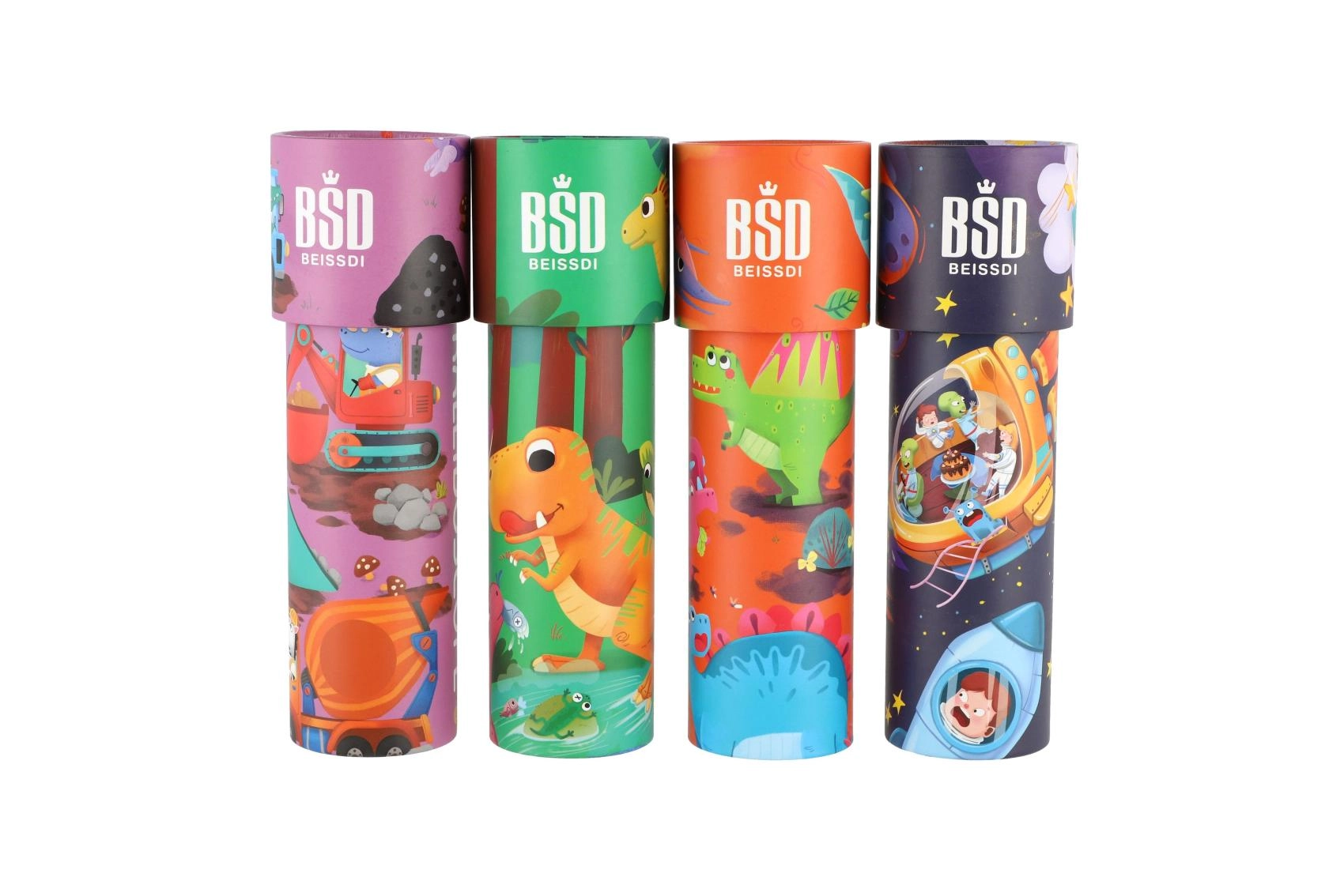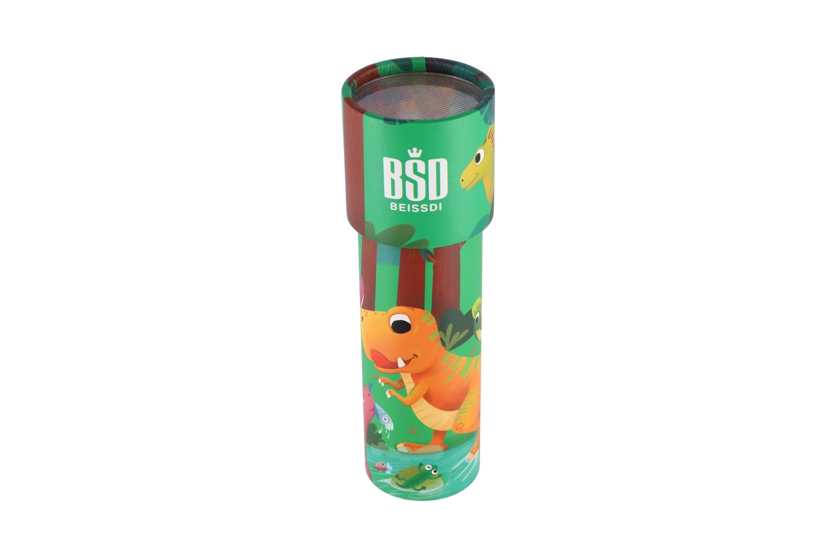 Des illustrations ludiques de dinosaures stimulent l’imagination des enfants et font du kaléidoscope un petit cadeau attrayant.