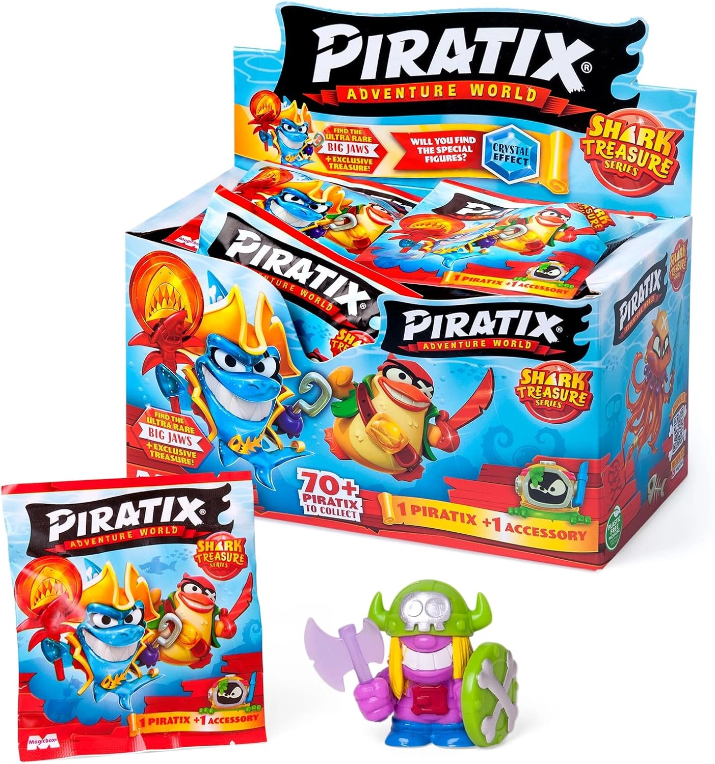 La série Shark Treasure propose plus de 70 figurines à collectionner – combinez-les, jouez et créez vos propres histoires de pirates de l’Île du Requin. Le sachet est parfait comme petit cadeau, récompense ou ajout à une collection.