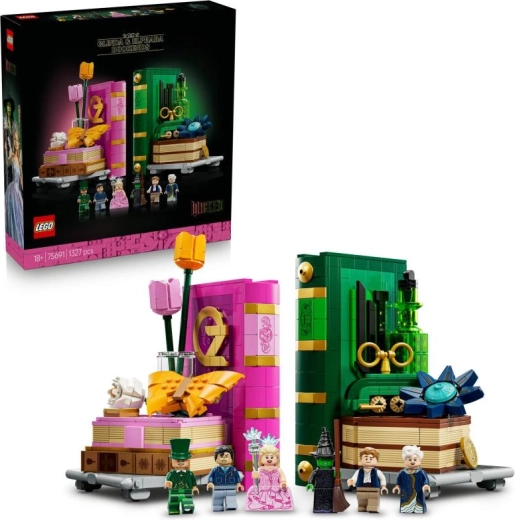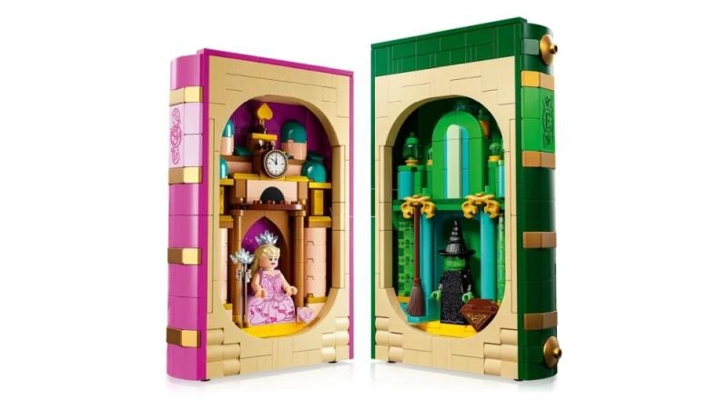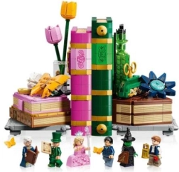 Ce set LEGO crée une paire de charmants dioramas de livres qui servent à la fois de serre-livres et de décoration originale. La scène rose et or évoque délicatement Glinda avec des motifs de tulipes et de papillons, tandis que la partie vert et or avec des clés et des détails émeraude rappelle l’univers d’Elphaba. Des éléments ouvrants et à charnières révèlent de petites scènes miniatures pour exposer les personnages et jouer des histoires.