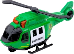 L’hélicoptère vert avec rotors tournants enrichit les histoires de recherche et de transport de dinosaures.