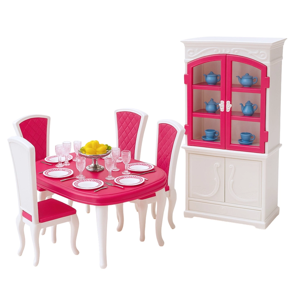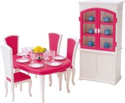 Élégant ensemble de meubles et d’accessoires pour poupées d’environ 29 cm qui transforme toute maison de poupée en salle à manger réaliste. Comprend une table, des chaises, un buffet avec portes ouvrantes et une riche vaisselle de table. Conception en plastique résistante, coloris rose‑blanc et style classique favorisant le jeu créatif, le développement des compétences sociales et les jeux de rôle. Conforme aux normes CE et EN71.