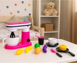 Le mignon mixeur rose et blanc MY LITTLE HOME imite fidèlement un robot de cuisine – la tête se relève, le fouet tourne vraiment et le bol s’enlève facilement. Les enfants profiteront d’un jeu de cuisine réaliste, entraîneront leur motricité fine et développeront leur créativité en préparant des « desserts » et des « cocktails » avec les aliments en plastique fournis.