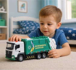 L’attraction principale est la benne relevable et abaissable, dans laquelle on peut “verser” les déchets et les vider dans l’arrière du véhicule – idéal pour développer la motricité fine et l’imagination. Les effets lumineux et sonores intégrés plongent les enfants dans l’action et dynamisent le jeu.