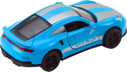 Le modèle GTRS est fabriqué en métal de qualité avec des éléments en plastique, ce qui lui permet de supporter un usage quotidien tout en offrant un beau rendu en exposition. Grâce aux portes ouvrantes, l’imagination se développe et chacun peut créer ses propres histoires de course. Le mécanisme à remonter pull back garantit un départ rapide et un amusement dynamique sans piles.