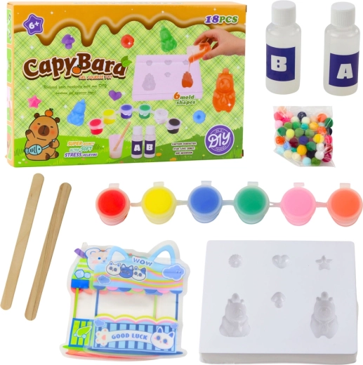 Découvrez un kit créatif amusant grâce auquel les enfants réalisent facilement leurs propres figurines en gel souples de différentes formes – de la capybara à l’étoile, au cœur, au donut et au champignon. Il suffit de mélanger le gel A + gel B, d’ajouter un pigment et de couler dans le moule. Les créations obtenues sont élastiques, agréables au toucher et parfaites comme jouet antistress.