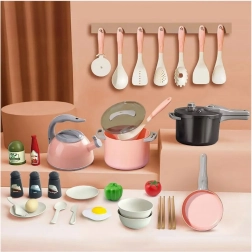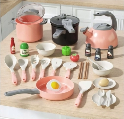 Découvrez le plaisir de cuisiner avec ce grand set de cuisine pour enfants de 32 pièces dans de doux tons roses et gris. Des casseroles, une poêle et une théière réalistes complètent la vaisselle, les couverts, les pots à épices et les aliments pour un jeu de cuisine authentique. Une conception sûre et résistante favorise la créativité, la motricité fine ainsi que les compétences sociales lors des jeux de rôle.