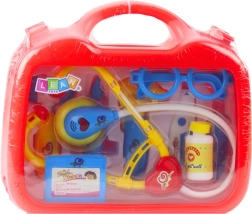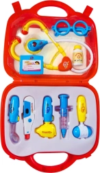 stéthoscope, seringue, thermomètre, otoscope/marteau à réflexes, lunettes, ampoule/flacon, badge d’identification et autres accessoires, mallette