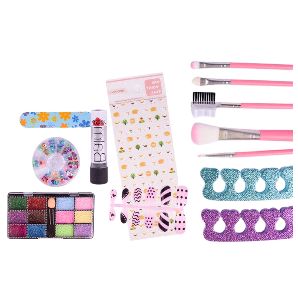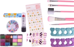 Le set inclut une palette de fards à paupières, un « rouge à lèvres » de jeu, des pinceaux, des applicateurs, un séparateur de doigts et des décorations pour ongles. Grâce aux couleurs vives et à la diversité des éléments, les enfants profiteront d’un divertissement long, captivant et créatif à la maison comme en déplacement.