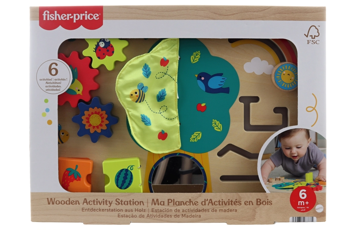 La planche de jeu interactive en bois Fisher-Price Jardin propose 6 activités sensorielles pour les tout-petits. Les enfants entraînent leur motricité fine, leur perception sensorielle et leur raisonnement logique. Fabriquée en bois certifié FSC et peinte avec des peintures à base d’eau non toxiques. Convient à partir de 6 mois.