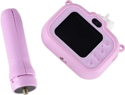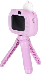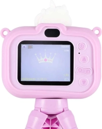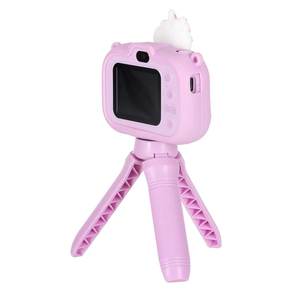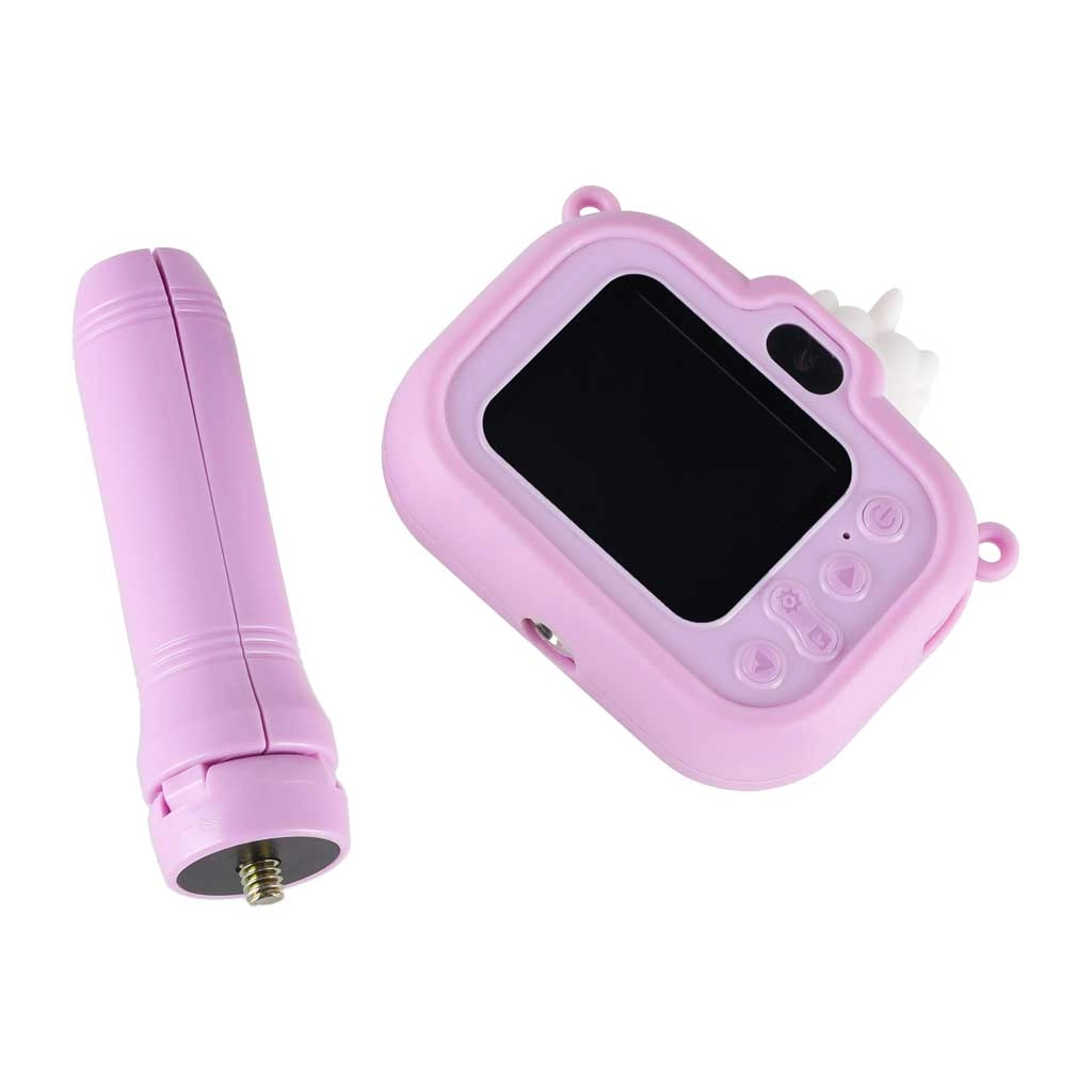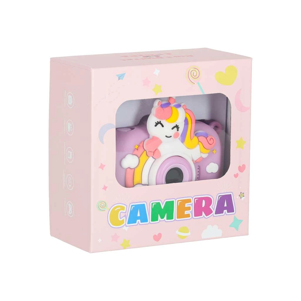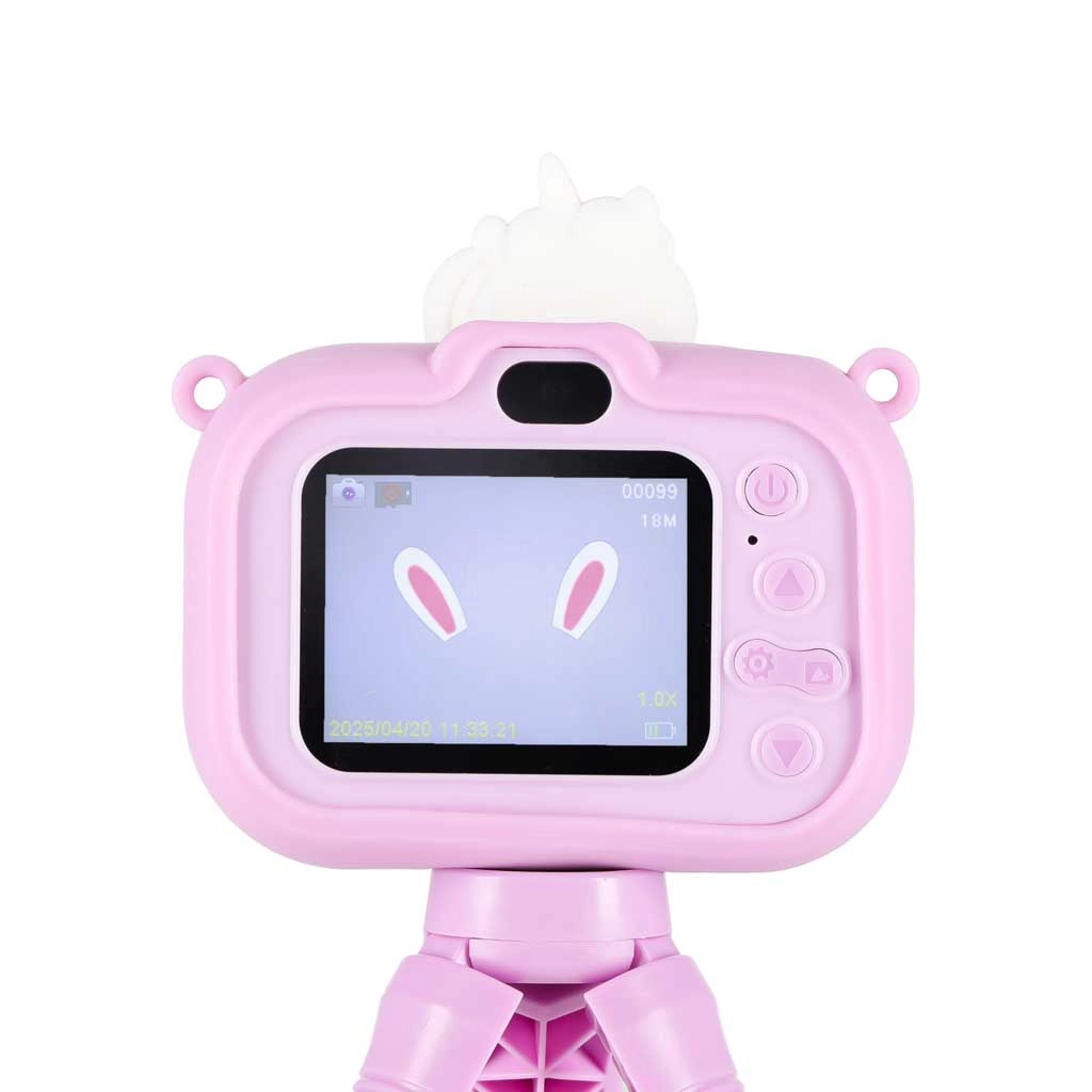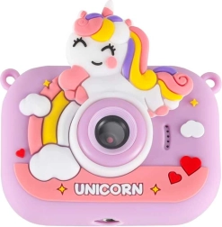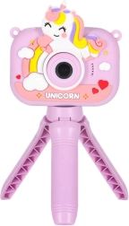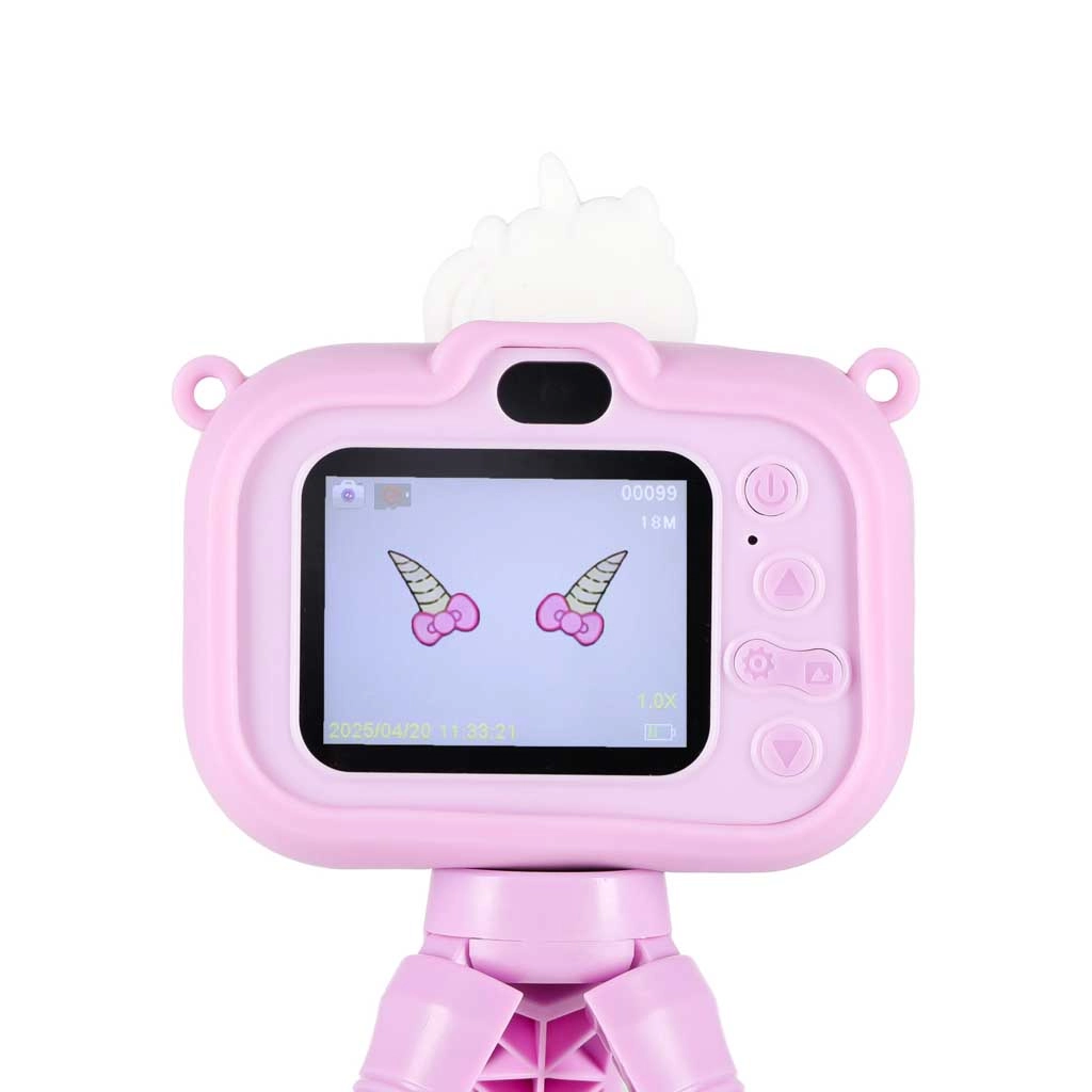 Adorable appareil photo pour enfants au motif UNICORN avec minitrépied stable, idéal dès 3 ans. Il offre un double objectif pour des photos faciles et des selfies, un enregistrement vidéo Full HD 1080p, un écran IPS 2,0" clair, jusqu’à 4 heures d’autonomie et un étui en silicone pour une prise en main sûre. Sont inclus dans la boîte une sangle réglable et un câble USB pour la recharge.