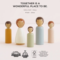 Cette famille en bois est fabriquée à la main en bois FSC® de haute qualité et peinte avec des peintures écologiques à base d’eau. Les surfaces lisses et les formes arrondies favorisent un jeu en toute sécurité, tandis que la palette neutre et les lignes épurées stimulent l’imagination et la narration créative.