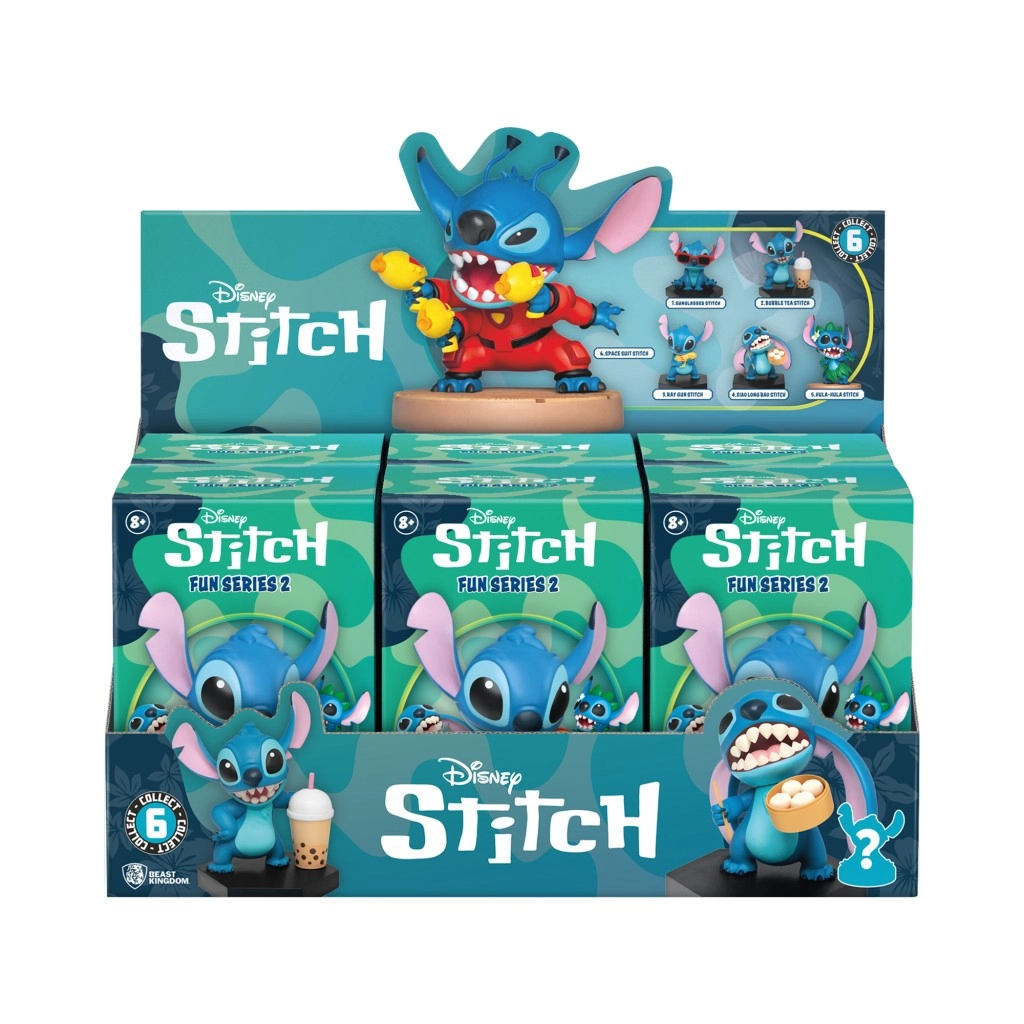 La série comprend six variantes uniques – par exemple Stitch avec un thé aux perles, en costume rouge avec des poussins, ou avec un panier-repas. Grâce à sa fabrication de qualité et à son socle stable, la figurine est parfaite sur une étagère, en vitrine ou comme cadeau stylé.