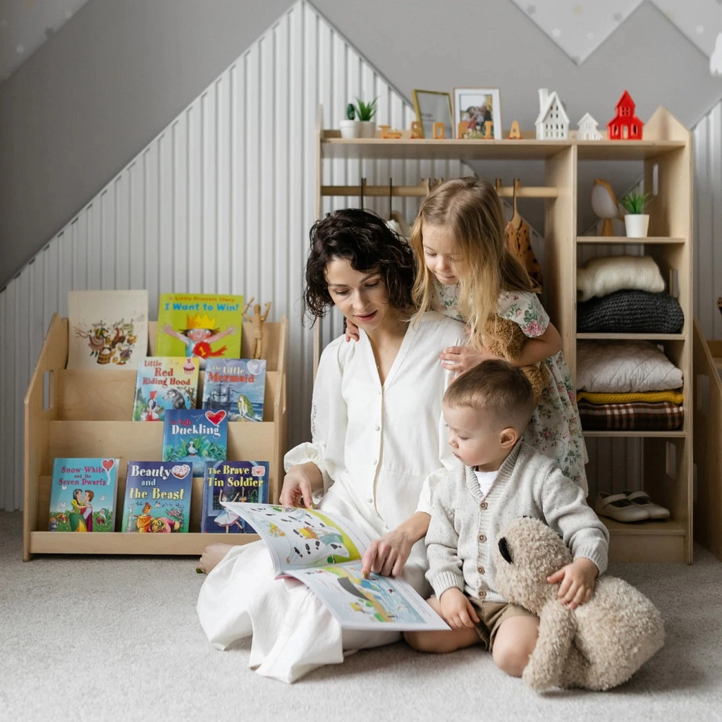 Les enfants voient immédiatement leurs livres favoris et peuvent les choisir et les remettre eux-mêmes à leur place. Encourage la lecture régulière et l’ordre dans la chambre.
