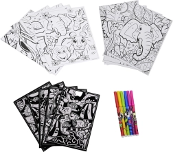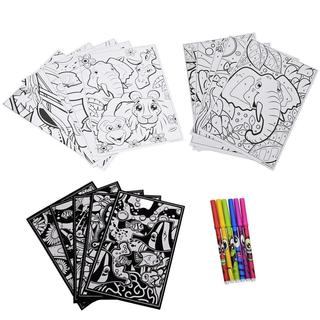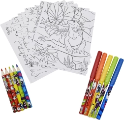 Le coffret inclut des coloriages d’animaux, des feutres parfumés et des crayons de couleur – idéal pour colorier rapidement et en couleurs à la maison comme en voyage.