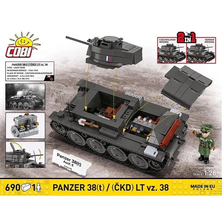 Construisez un char léger emblématique dans deux versions historiques avec le jeu de construction de qualité COBI. Ce modèle 2-en-1 permet de choisir entre le LT vz. 38 tchécoslovaque et sa variante allemande Panzer 38(t). Profitez d'détails à l’échelle 1:28, de chenilles réalistes, de trappes ouvrantes, d’un canon mobile et de marquages durables. Inclut également une minifigurine et une plaque de collection.