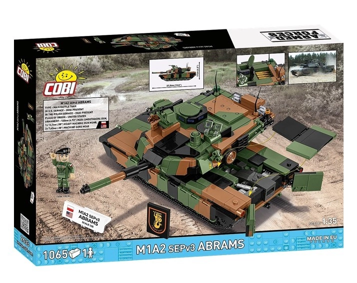 Construisez l’iconique char moderne M1A2 SEPv3 Abrams avec marquages polonais. Le kit à l’échelle 1:35 offre 1069 pièces de qualité, une tourelle pivotante à 360°, un canon orientable, des chenilles fonctionnelles, des trappes et capots de service ouvrants. Inclus également : une minifigurine de tankiste, des plaques de collection et des décors imprimés durables sans autocollants.