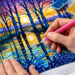 Réalisez votre propre tableau scintillant grâce à la technique de la peinture diamant. Avec la toile préimprimée et une légende claire, vous appliquerez facilement les strass aux emplacements indiqués et composerez pas à pas une mosaïque détaillée représentant des bouleaux au bord du lac. Cette activité apporte calme, concentration et joie de créer.