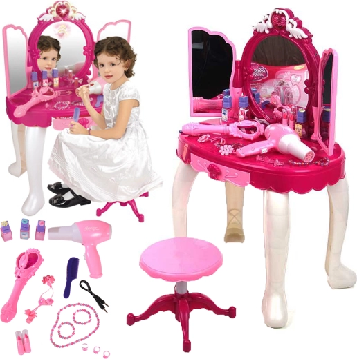 Transformez la chambre en un petit coin beauté. Cette coiffeuse aux effets ludiques propose un jeu interactif grâce à la baguette magique qui ouvre le miroir, ainsi que la possibilité de connecter une MP3 pour écouter les chansons préférées. Les lumières et les sons créent une atmosphère féérique et stimulent le jeu créatif.