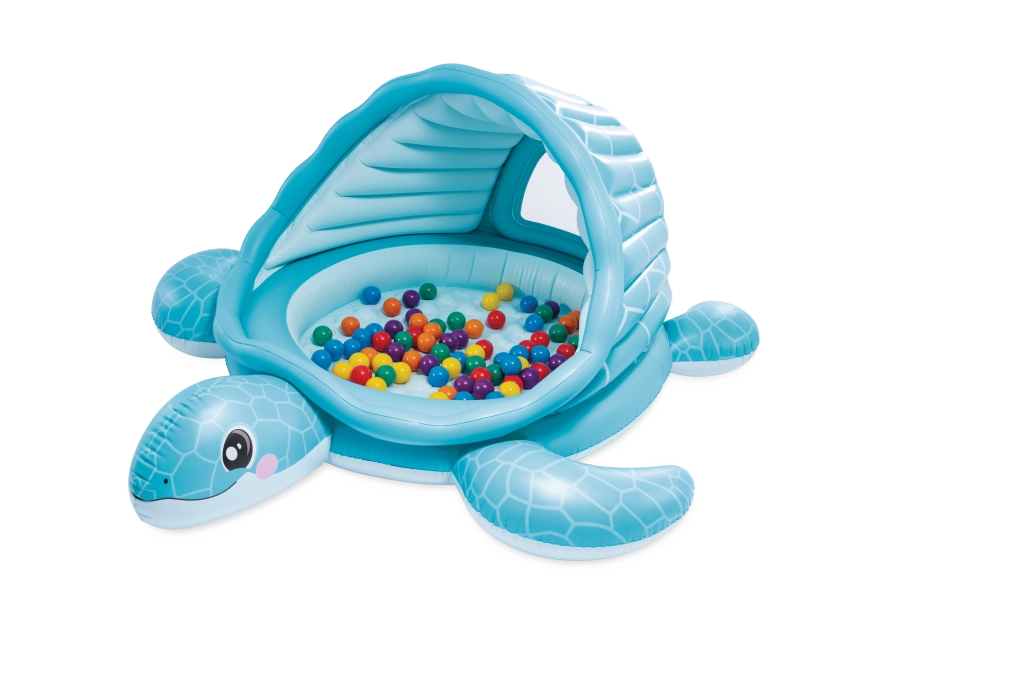 L’auvent procure une ombre agréable et une meilleure protection solaire. Les fenêtres en maille latérales garantissent la ventilation et permettent aux parents une surveillance aisée. La piscine est suffisamment spacieuse pour les jeux d’eau et fait aussi office de coin de jeu à sec avec des balles.