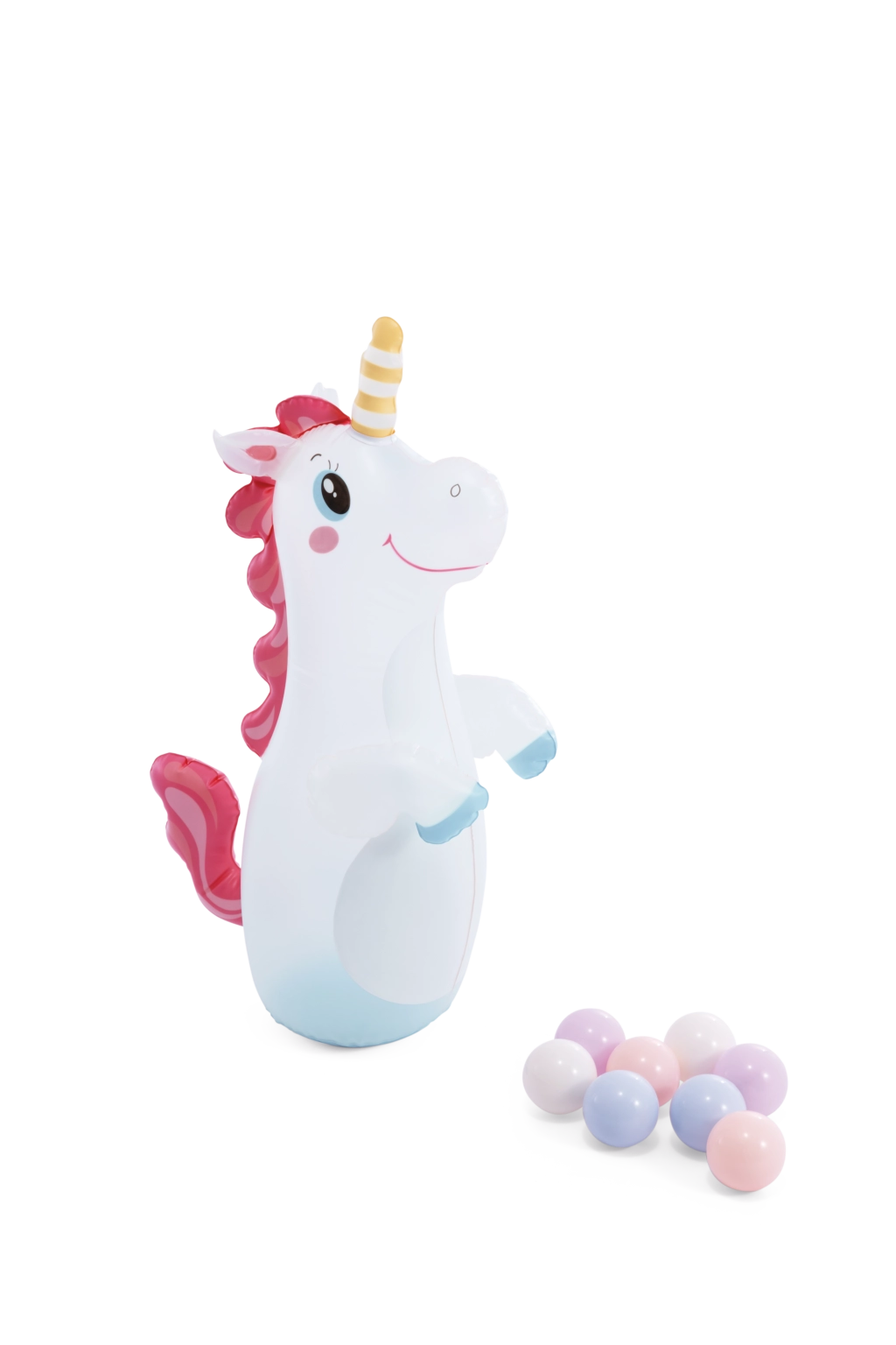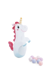 La licorne gonflable et 8 balles colorées encouragent le jeu actif, le lancer à travers l’anneau et le développement de la coordination.