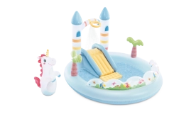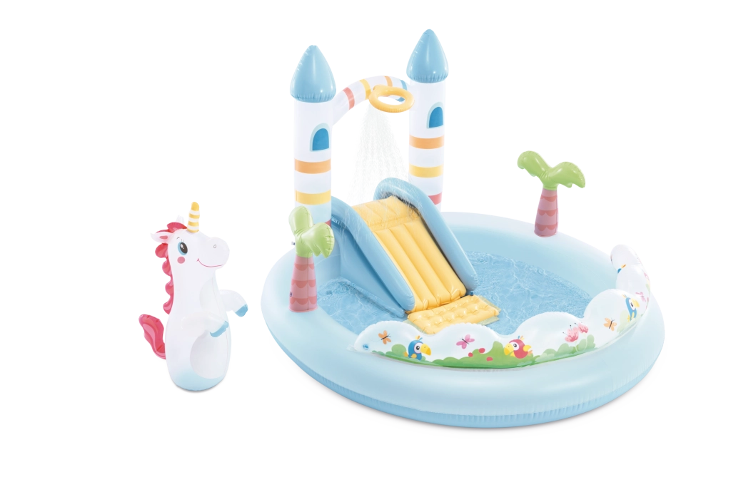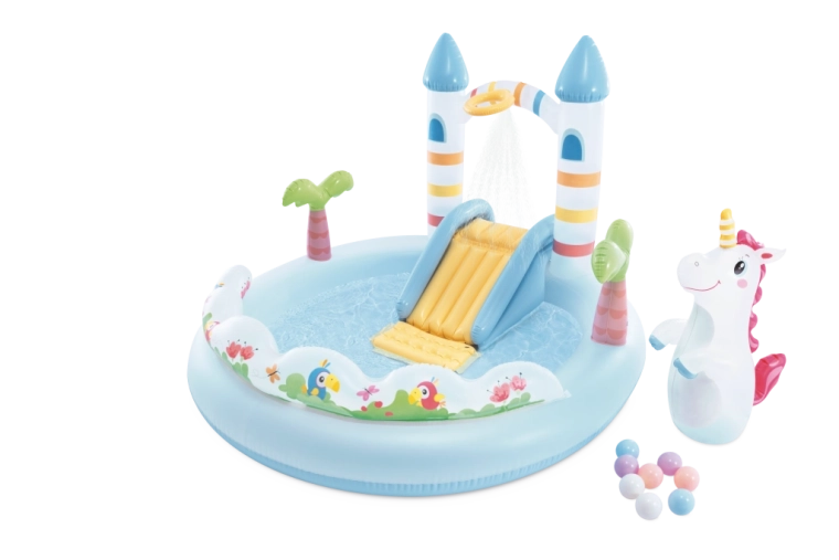 Transformez votre jardin en lieu féerique avec le centre de jeu Château de licorne – un ensemble aquatique gonflable pour enfants dès 2 ans. Il offre une petite piscine peu profonde, un toboggan souple avec zone d’arrivée rembourrée, une douche d’eau après raccordement du tuyau d’arrosage, ainsi que des accessoires ludiques, dont une licorne gonflable et des balles colorées pour jouer et développer la motricité.