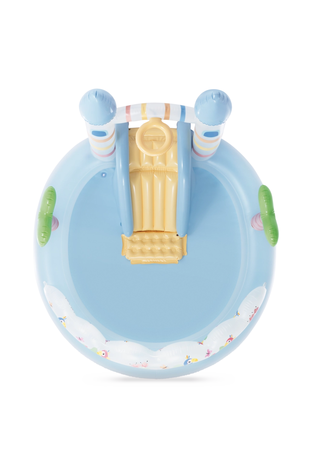 - bassin bleu clair, toboggan jaune, décorations colorées