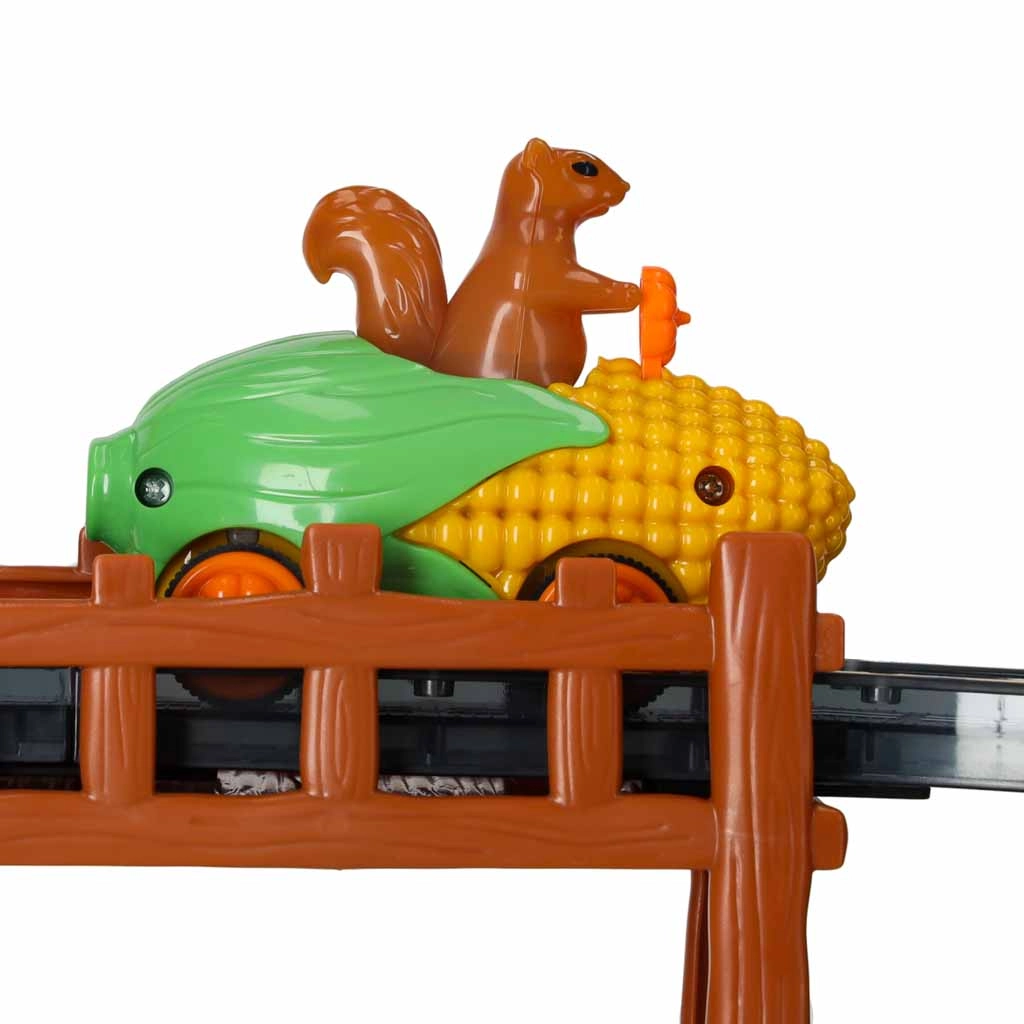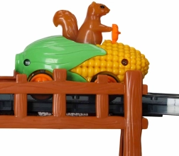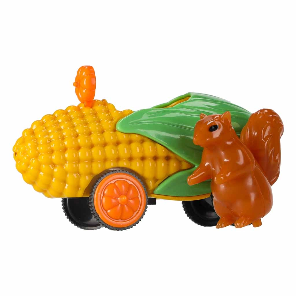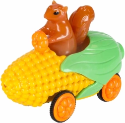 Une voiture adorable en forme de maïs avec un écureuil au volant apporte couleurs et lumière au jeu. Une motivation parfaite pour les petits pilotes et les courses du soir.