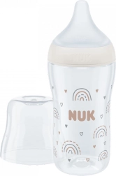 L’indicateur de température NUK intégré change de couleur du bleu (froid) au blanc (trop chaud) afin d’aider à éviter de servir une préparation trop chaude. La température idéale est d’environ 37 °C, lorsque l’indicateur est bleu. Le biberon est fabriqué en verre résistant et hygiénique, sans BPA et conforme à la norme européenne EN 14350.