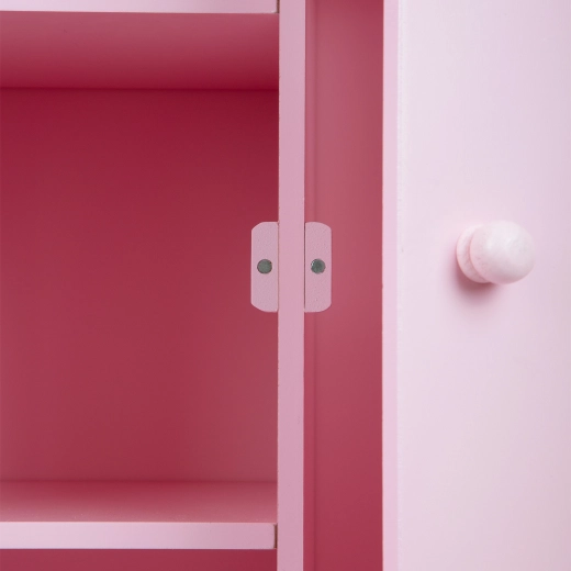 Cette armoire en bois de qualité, dans une douce teinte rose, est idéale pour organiser clairement les vêtements et accessoires de vos poupées. La partie gauche propose deux étagères pratiques, la partie droite est équipée d’une tringle pour les petites robes. La porte à fermeture magnétique se manipule facilement et les découpes étoile et lune apportent un charme supplémentaire au meuble.