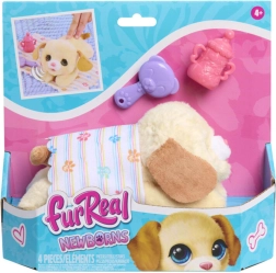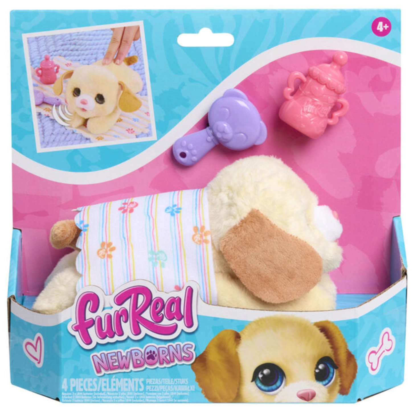 Adorable chiot interactif FurReal Newborns que tous les enfants amoureux des animaux vont adorer. Il a un corps en peluche tout doux, de grands yeux bleus et un petit nez rose. Il réagit aux caresses sur le dos par des sons joyeux et, après avoir été nourri au biberon ou brossé, il ferme les yeux et émet des sons de bonheur. Sont inclus un accessoire tétine, un biberon, une brosse et une couverture pour encore plus de soins et de câlins.