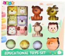- 6× cubes carrés avec animaux, 6× éléments ronds pour construire une tour, 3× figurines d’animaux, 3× balles sensorielles