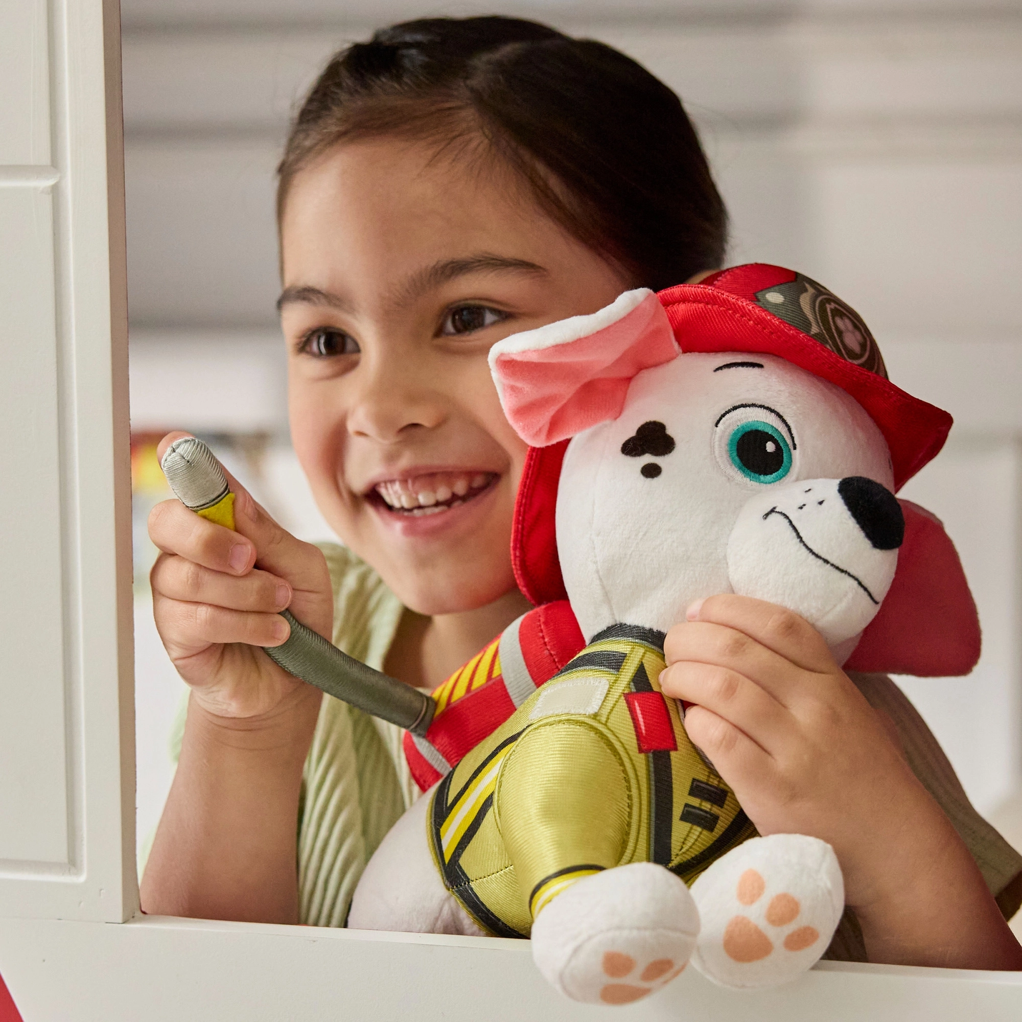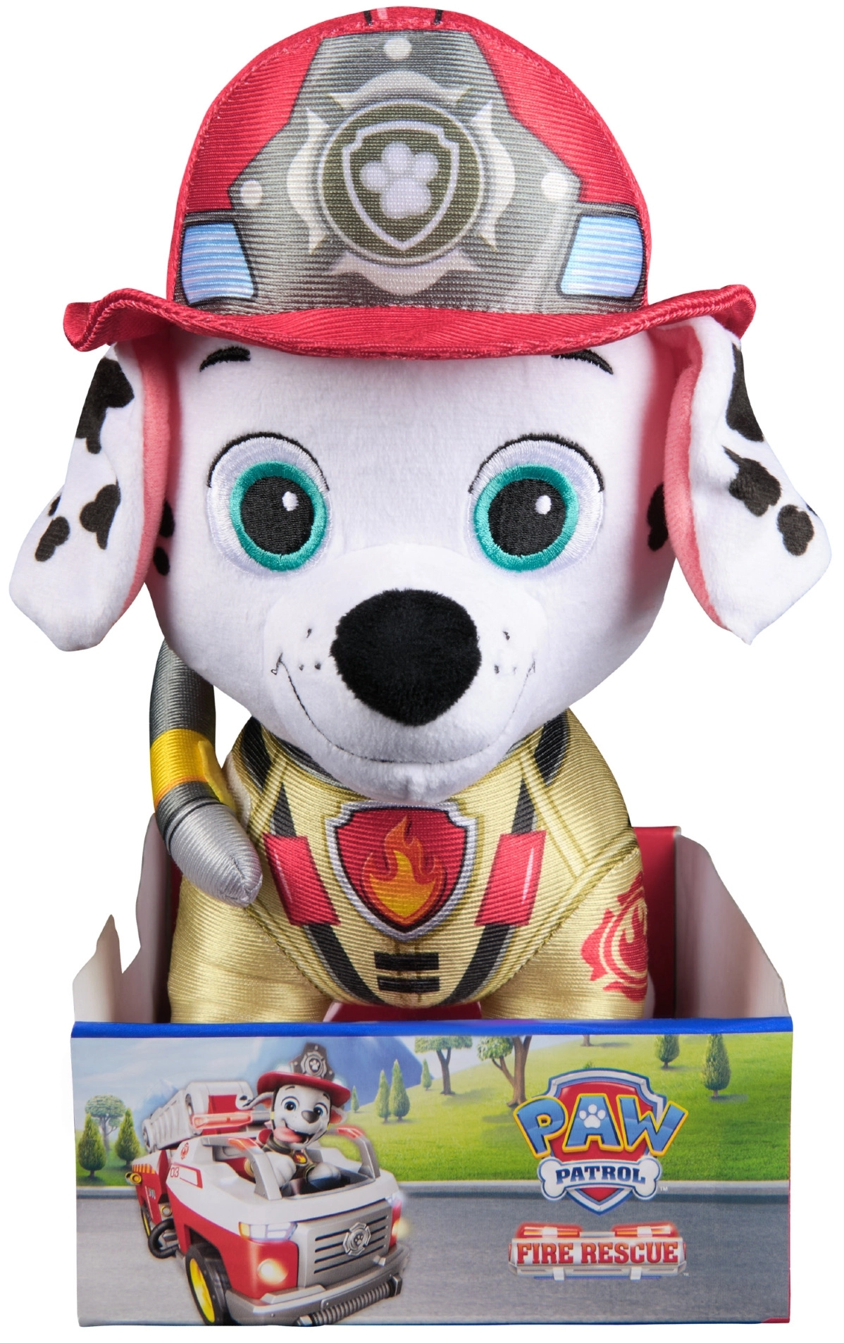 Les enfants adoreront son look authentique – pelage blanc à taches noires, casque rouge, gilet jaune et tuyau souple. Des yeux brodés sécurisés et l’absence de petites pièces détachables en font un excellent choix pour le jeu de rôle sur le thème du sauvetage.