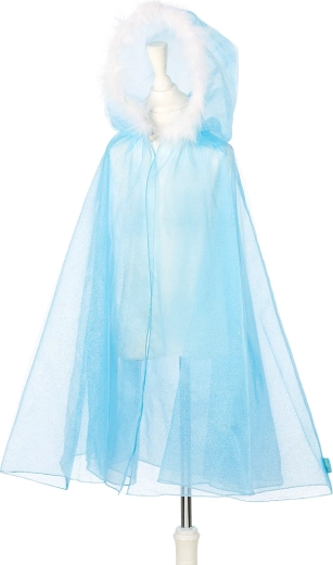 La cape de reine des glaces pour les 5–7 ans offre une allure magique grâce à son tulle délicat à deux couches dans une teinte bleue scintillante et légèrement transparente. La capuche bordée de « fourrure » blanche apporte une touche hivernale, et la fermeture au cou par bouton et bride assure un port facile et sécurisé.