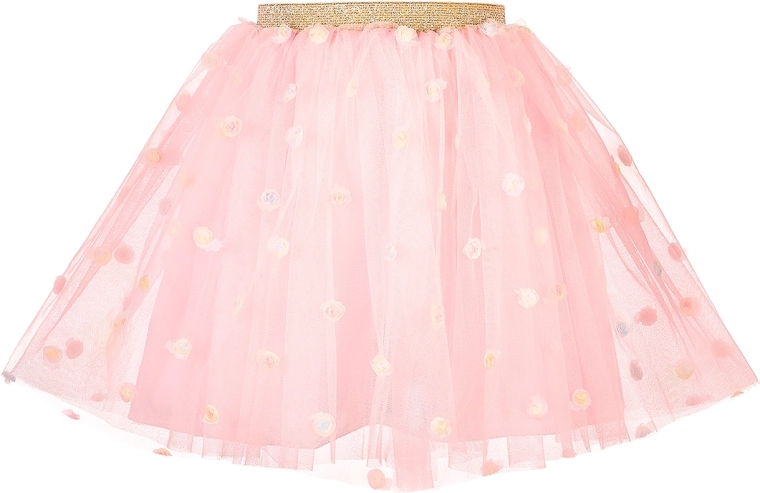 Adorable jupe en tulle rose clair pour petites filles de 3–5 ans, au coupe évasée classique, avec taille élastique réglable et petites roses sur plusieurs couches de tulle. Elle possède une doublure lisse pour le confort et un ruban doré à la taille – idéale pour les fêtes, le carnaval, les séances photo et le jeu au quotidien.
