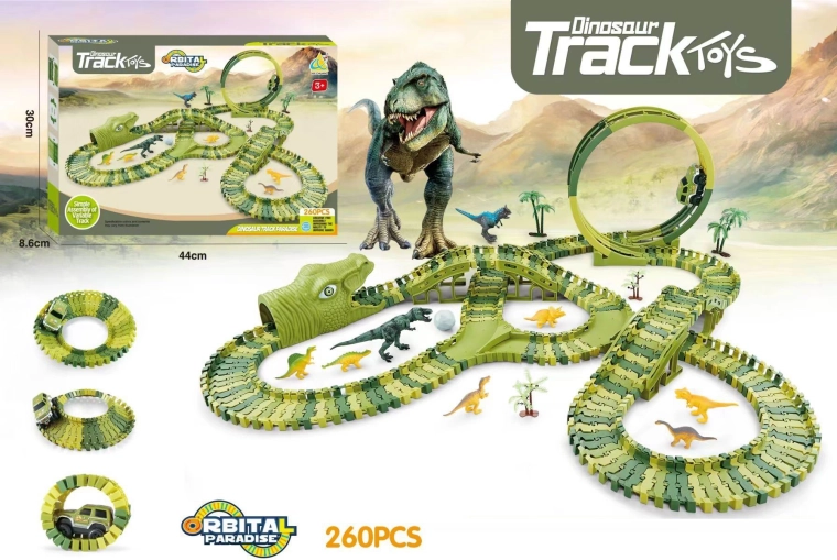 Ce circuit coloré sur le thème des dinosaures offrira aux enfants des heures de divertissement et stimulera leur imagination. Grâce à ses 260 pièces, la piste peut être assemblée en différentes formes et hauteurs, rendant chaque séance de jeu unique. Il comprend une petite voiture à piles qui parcourt la piste et incite les enfants au jeu créatif.