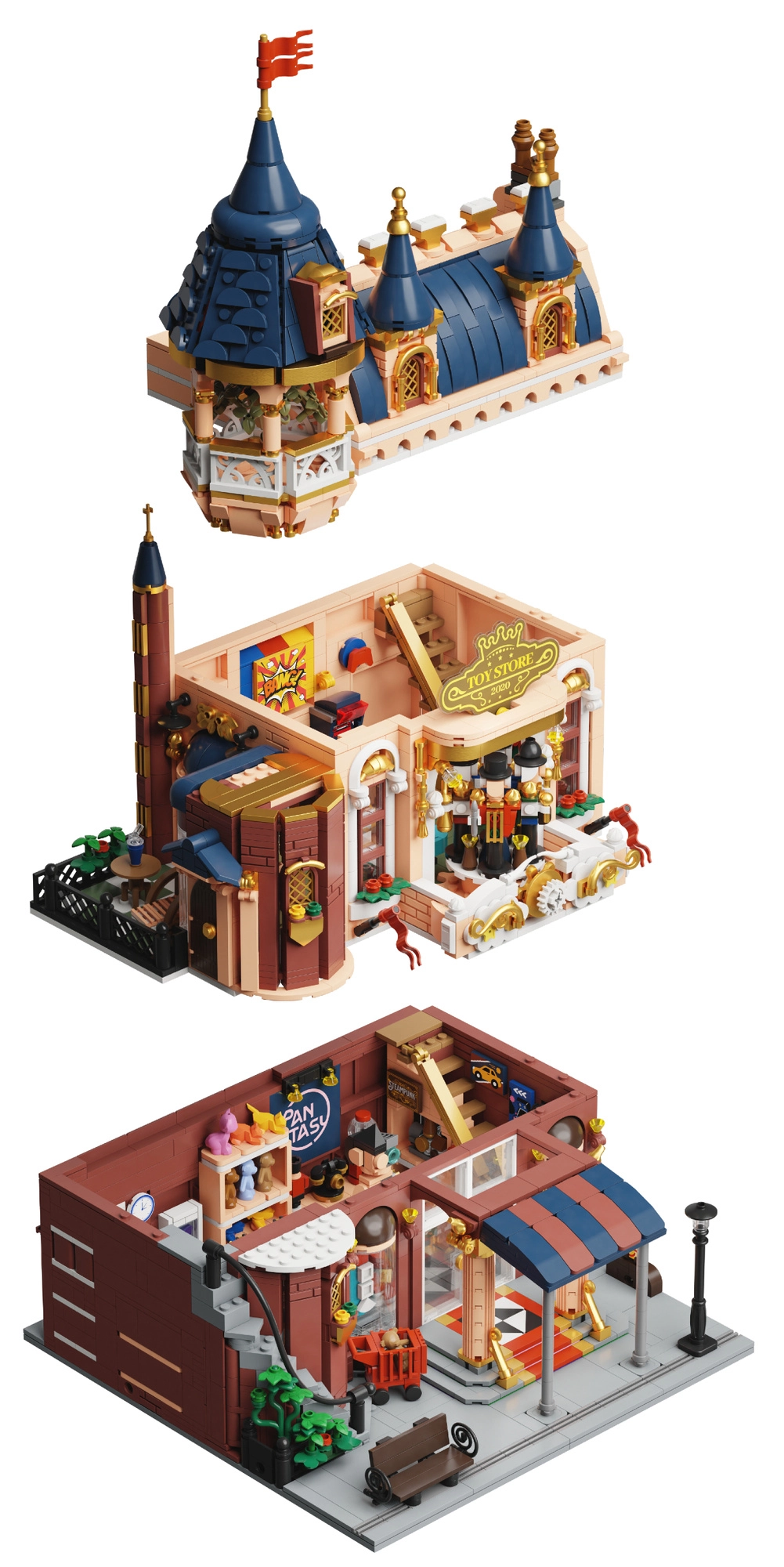 Le bâtiment se compose de trois étages facilement séparables : rez-de-chaussée – magasin de jouets avec modèles miniatures et expositions, 1er étage – salon de jeux rétro avec bornes d’arcade et jeux de société, et terrasse sur le toit avec pavillon pour se détendre. Quatre minifigurines animent des scènes du quotidien – vendeur, clients et enfants.