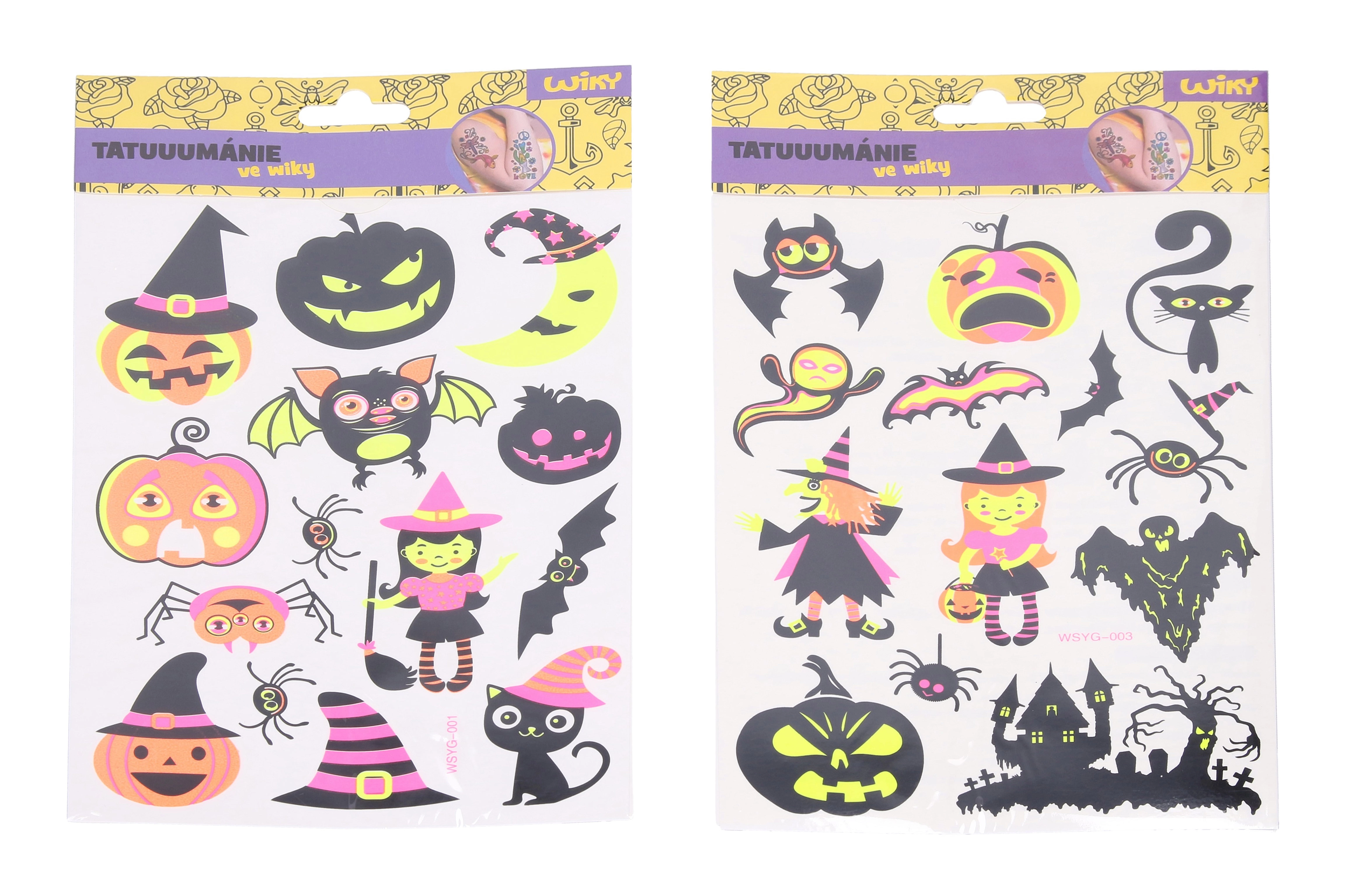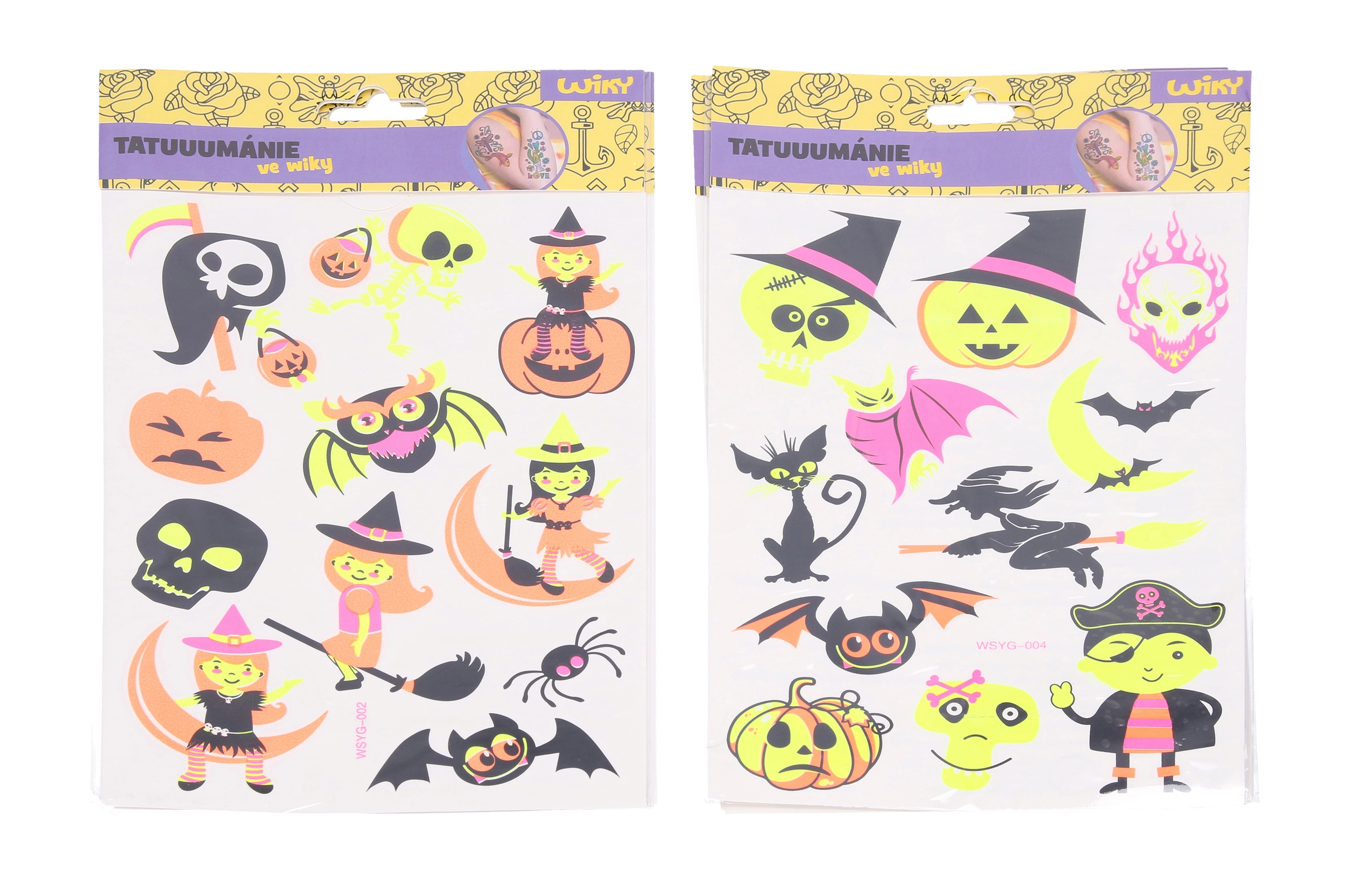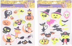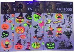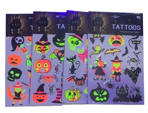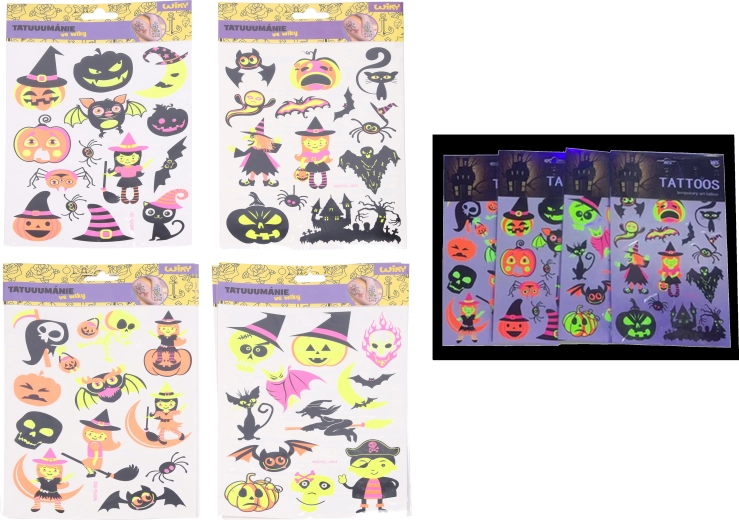 Découvrez de tatouages temporaires fluorescents sur le thème Halloween, qui brillent sous la lumière UV. Idéals pour les fêtes, carnavals et événements à thème, ils sont faciles à appliquer et tout aussi faciles à retirer. Taille de la planche 16,5 × 22 cm, disponibles en 4 variantes de motifs.