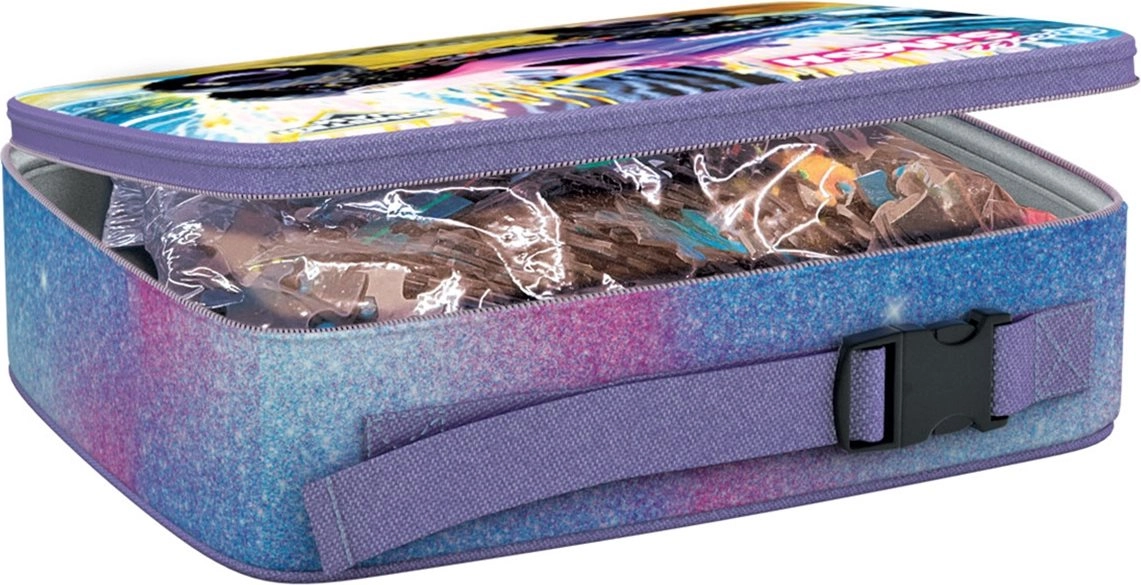Le puzzle est rangé dans un sac isotherme robuste avec fermeture éclair et sangle latérale pour un transport facile. Il garde les pièces bien organisées à la maison comme en déplacement.