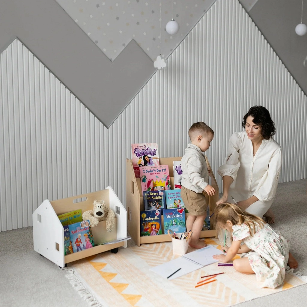Les livres sont présentés de face pour que les enfants voient immédiatement les couvertures et puissent choisir seuls. Favorise les habitudes de lecture et une organisation claire.