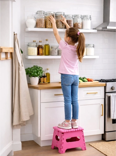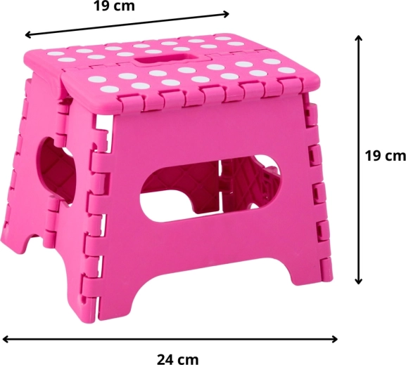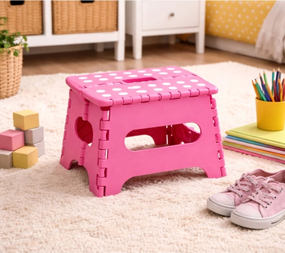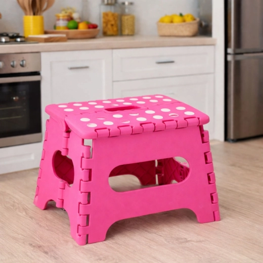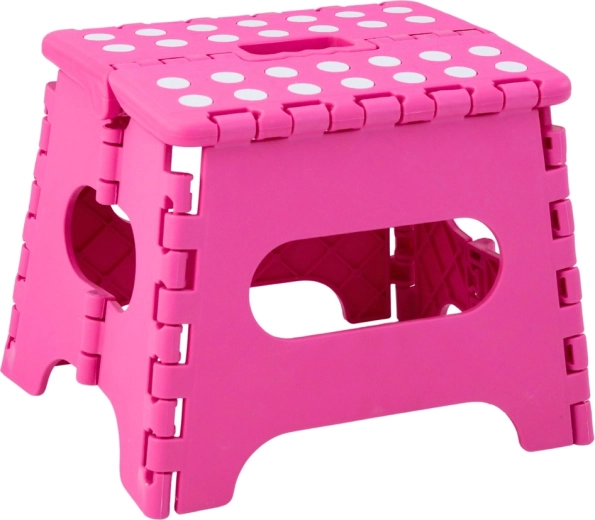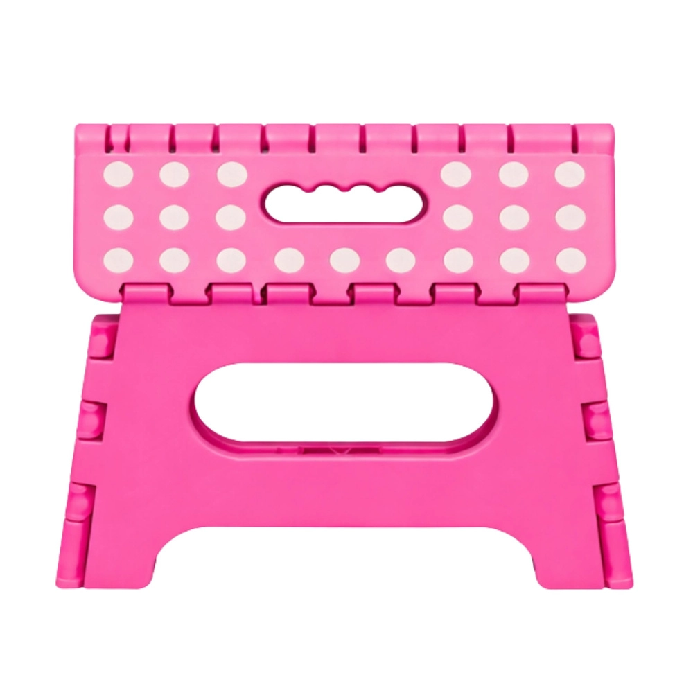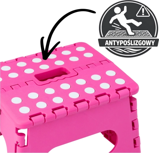Le marchepied pliant rose est fabriqué en plastique résistant, garantissant solidité et longue durée de vie. Sa surface supérieure antidérapante à pois améliore la sécurité d’utilisation, même en milieu humide. La poignée intégrée permet un transport rapide et un pliage facile à plat pour un rangement compact.