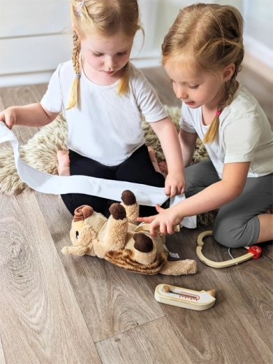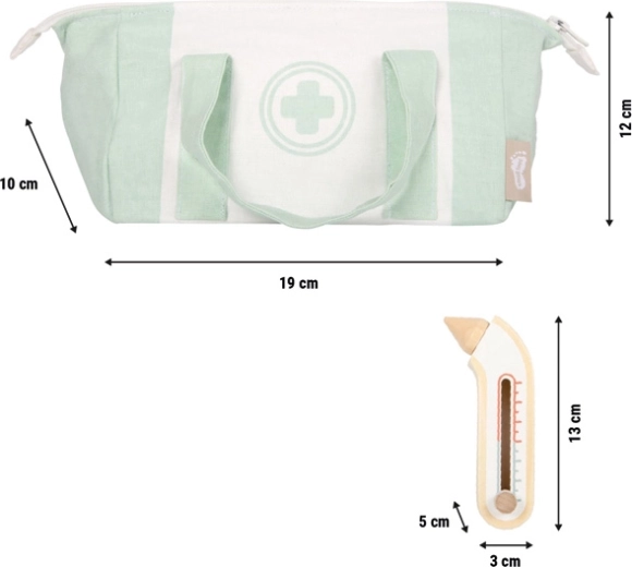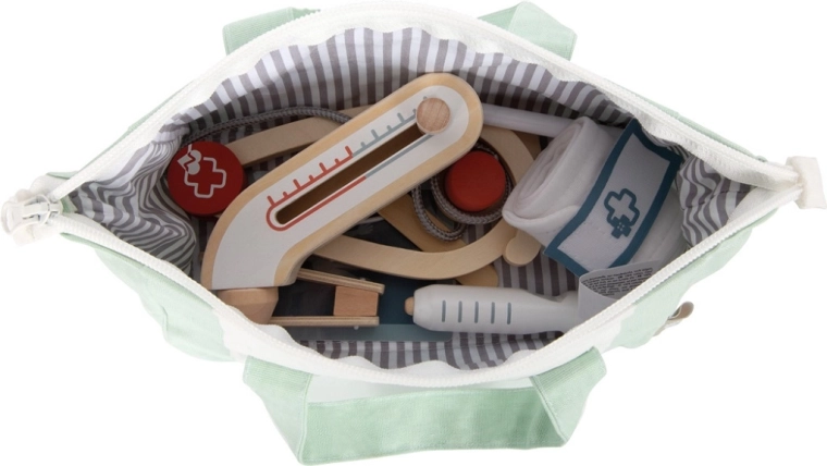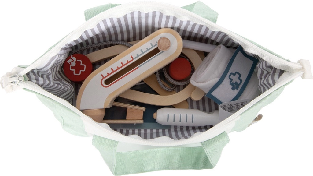 Le kit médical pour enfants dans un sac menthe et blanc associe des instruments en bois durables et des accessoires textiles souples pour un jeu sûr et pertinent. Grâce aux éléments réalistes – de l’écoute du cœur à la prise de température jusqu’à “l’application” d’une injection – les enfants exercent l’empathie et la communication tout en réduisant la peur de la visite chez le médecin.