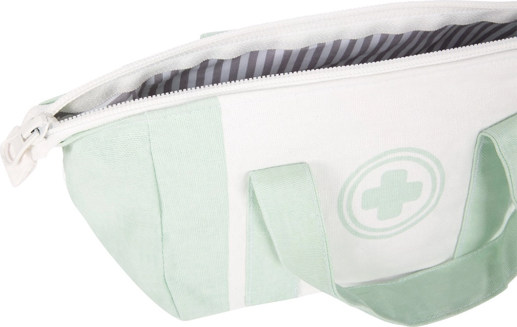 Le sac pratique zippé garde tout rassemblé et se transporte facilement. Le thermomètre réglable et la seringue à poussoir invitent à l’exploration et favorisent la coordination œil-main. Les fiches patient à écrire avec feutre développent l’imagination ainsi que les premiers pas vers la pensée logique.