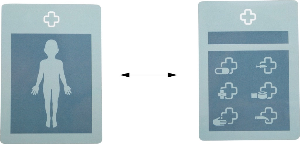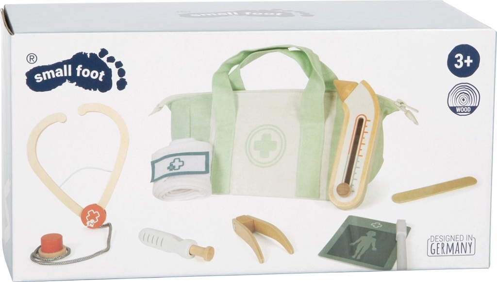- stéthoscope, seringue (à poussoir), thermomètre avec indicateur réglable, pince, spatule en bois, bandage textile avec velcro, fiches patient avec feutre, sac médical