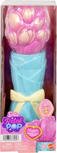 Barbie adopte un style tulipe rose – corsage orné et petite jupe superposée rappelant des pétales. Le coffret contient des surprises en sachets avec des accessoires tels que la figurine de lapin, un collier et des boucles d’oreilles, pour stimuler l’imagination et les histoires créatives.