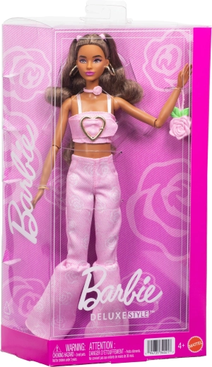 Cette poupée mode propose un style frais inspiré des dernières tendances. La tenue comprend un crop top orné d’un cœur et un pantalon long évasé à motif rose. Le look est complété par un sac rose en forme de rose, un collier motif rose et des boucles d’oreilles audacieuses – le tout harmonisé pour une allure spectaculaire.