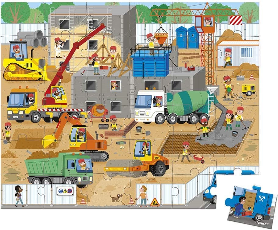 Ce puzzle en carton au design soigné JANOD sur le thème du chantier ravira les petits constructeurs et les amateurs de machines. Il est emballé dans une valisette solide avec poignée, parfaite pour voyager et pour le rangement à la maison. Un poster modèle est inclus pour aider les enfants lors de l’assemblage.