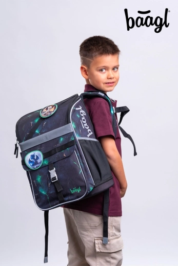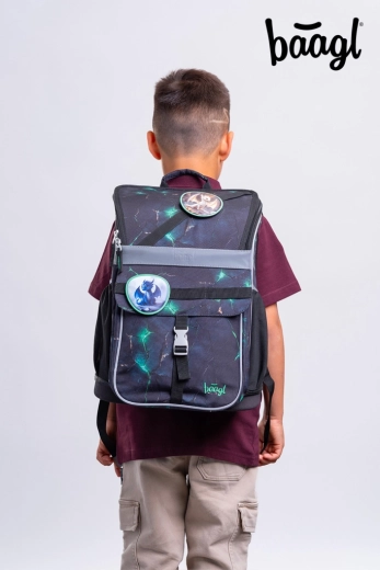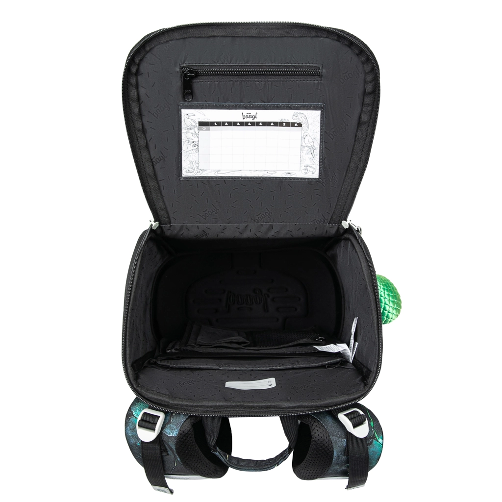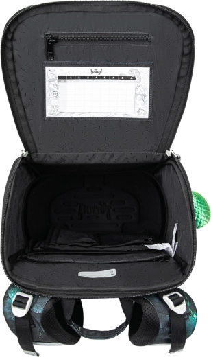 Un agencement pratique avec ouverture basculante facilite l’accès au matériel directement depuis le pupitre. À l’intérieur, on trouve un élastique pour maintenir le contenu près du centre de gravité, des poches latérales en matériau robuste pour la bouteille et des fermetures éclair fiables YKK pour une longue durée de vie. Un système unique d’insignes interchangeables permet aux enfants de changer le look selon leur humeur.