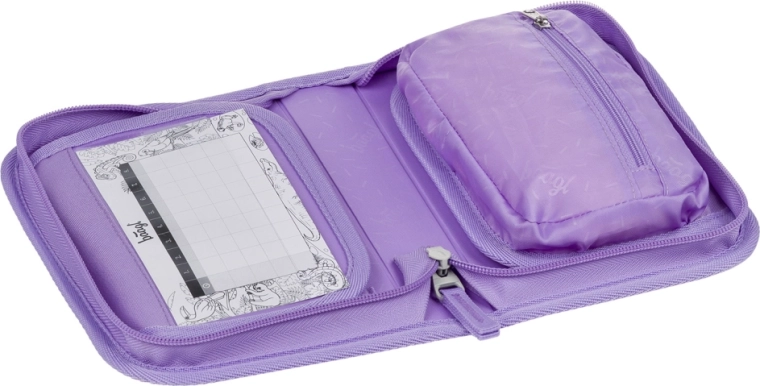 Une fois ouverte, la trousse se déplie entièrement. Deux rabats, des passants élastiques et des petites poches maintiennent crayons, stylos et accessoires bien à leur place.