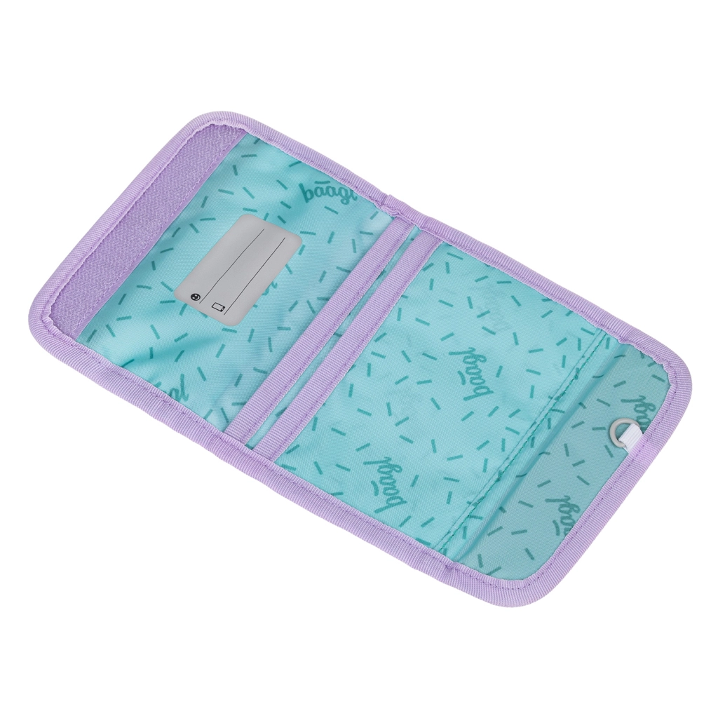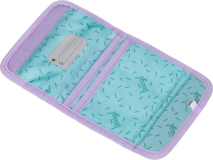 Portefeuille pour enfants élégant à porter autour du cou, coloris lavande, de BAAGL, pour transporter en toute sécurité petite monnaie, clés et cartes. Il offre une étiquette nominative, un cordon réglable avec sécurité, une poche séparée pour la monnaie et une fermeture à velcro en matière recyclée résistante.
