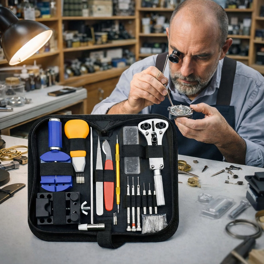 - Équipement complet : ouvre‑boîtier à clé, mors de rechange, tournevis de précision, chasse‑goupilles, outil pour barrettes, couteau à fond, support de boîtier, petit marteau, et plus encore.